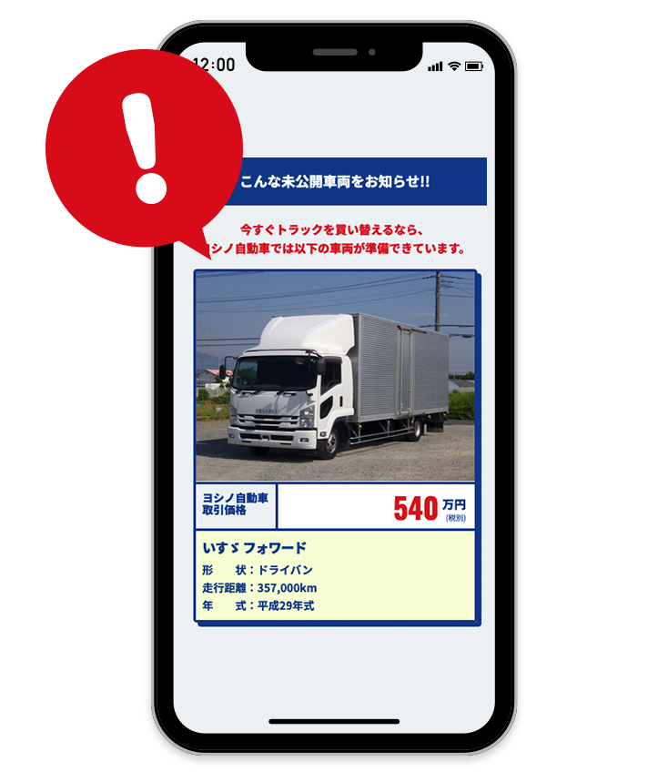 お持ちのトラック情報を登録すると、未公開車両情報や買い替えに最適な車両情報ををいち早くお知らせいたします。